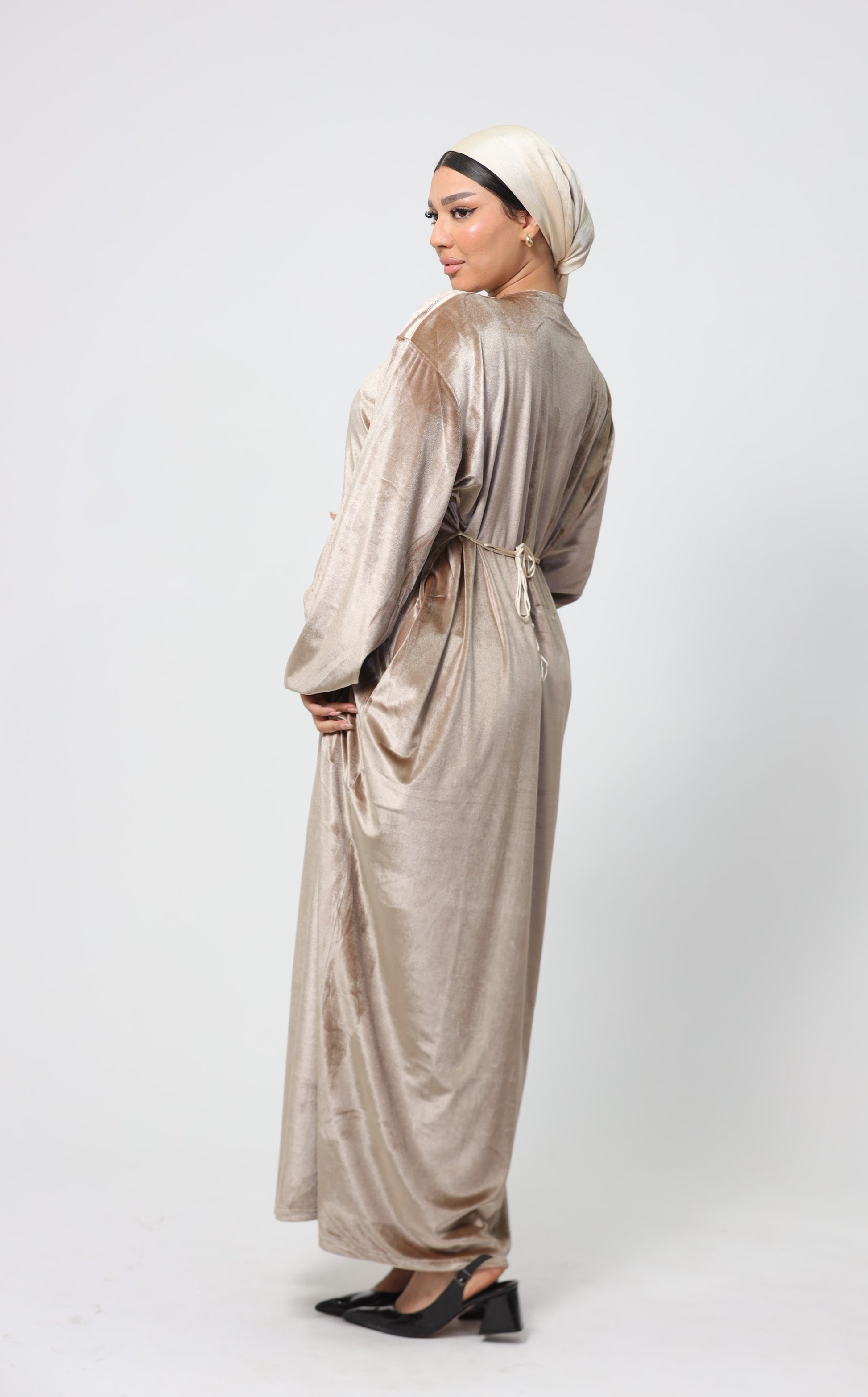 جبّة تقليدية راقية مصنوعة من قماش مخمل فاخر ، تتميّز بلمعان أنيق يضفي لمسة من الفخامة. تأتي بتصميم واسع ومريح يناسب جميع المقاسات، مع أكمام طويلة تمنح إطلالة محتشمة وعصرية في نفس الوقت.