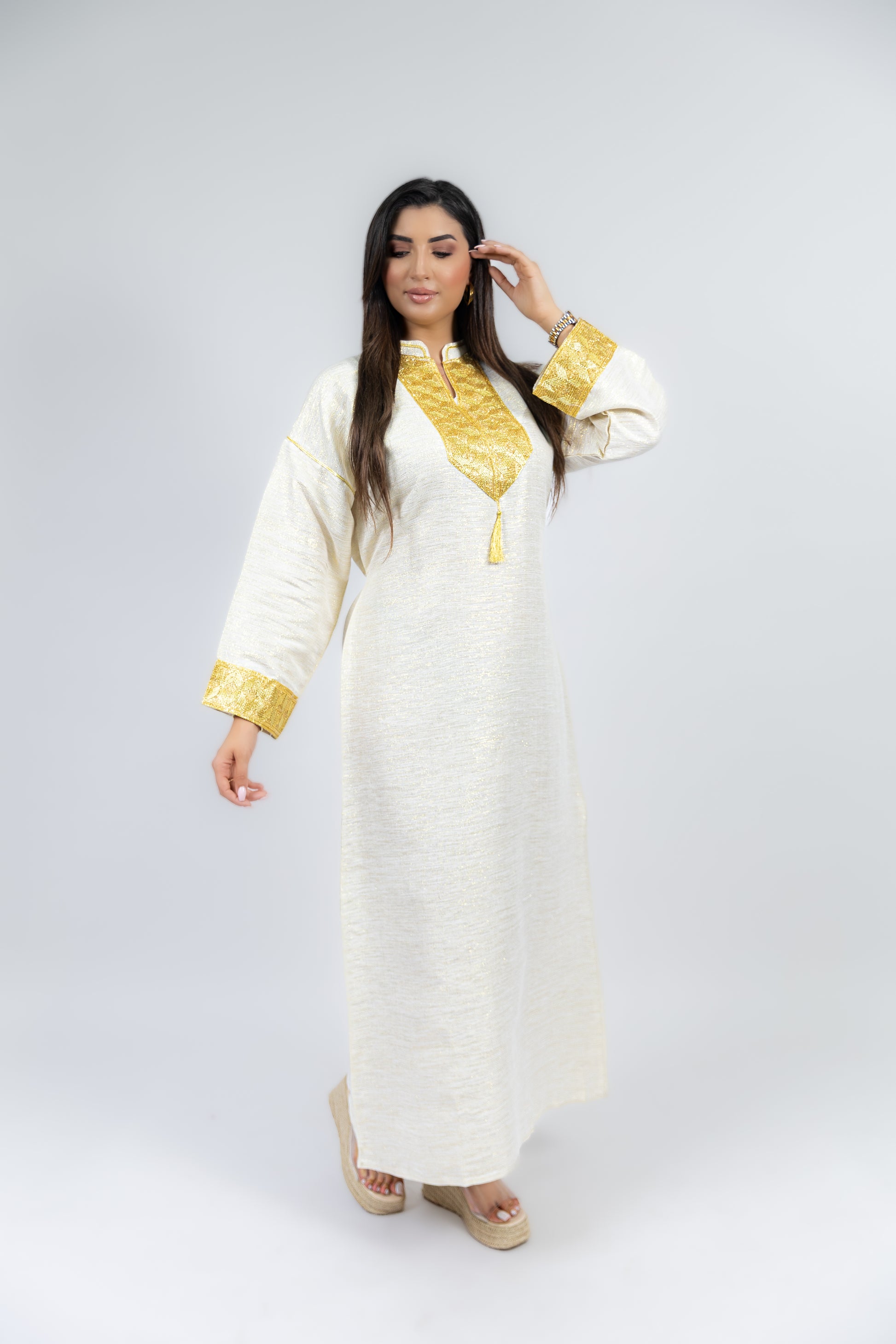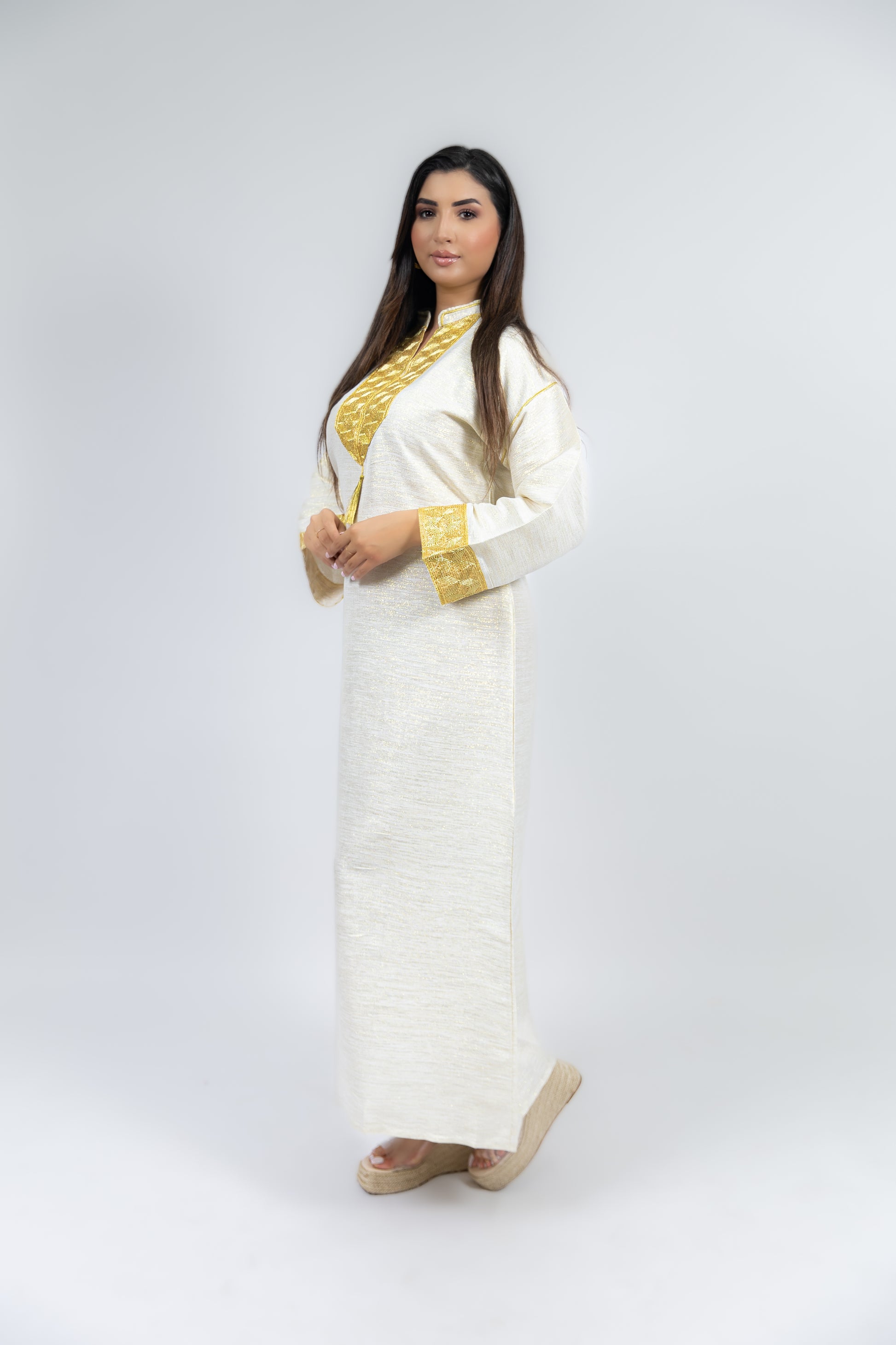 جبة تقليدية بيضاء اللي تجمع بين البساطة والأصالة. مزوّقة بتطريز ذهبي فاخر على الصدر والياقة والأكمام، تعطي لمسة من الأناقة والتميز في كل مناسبة.