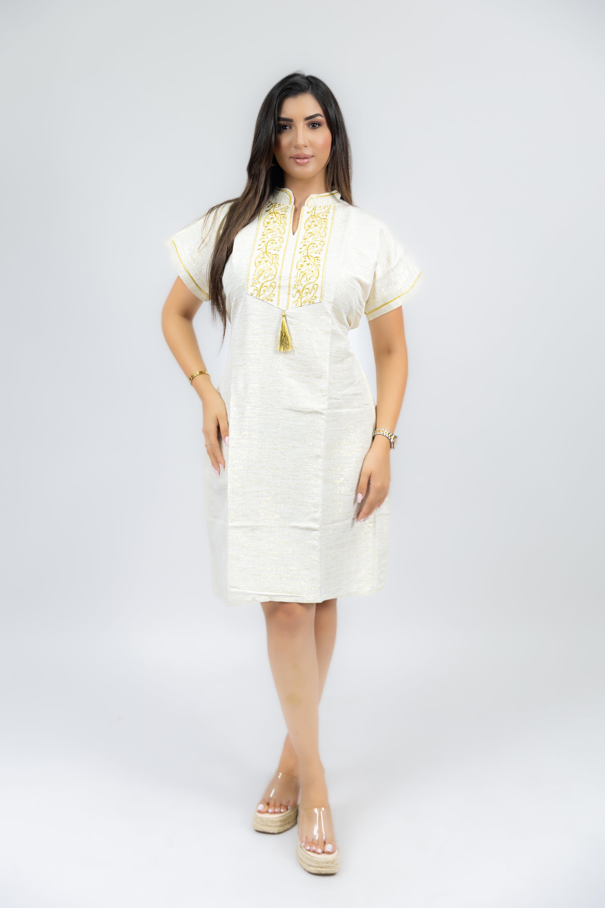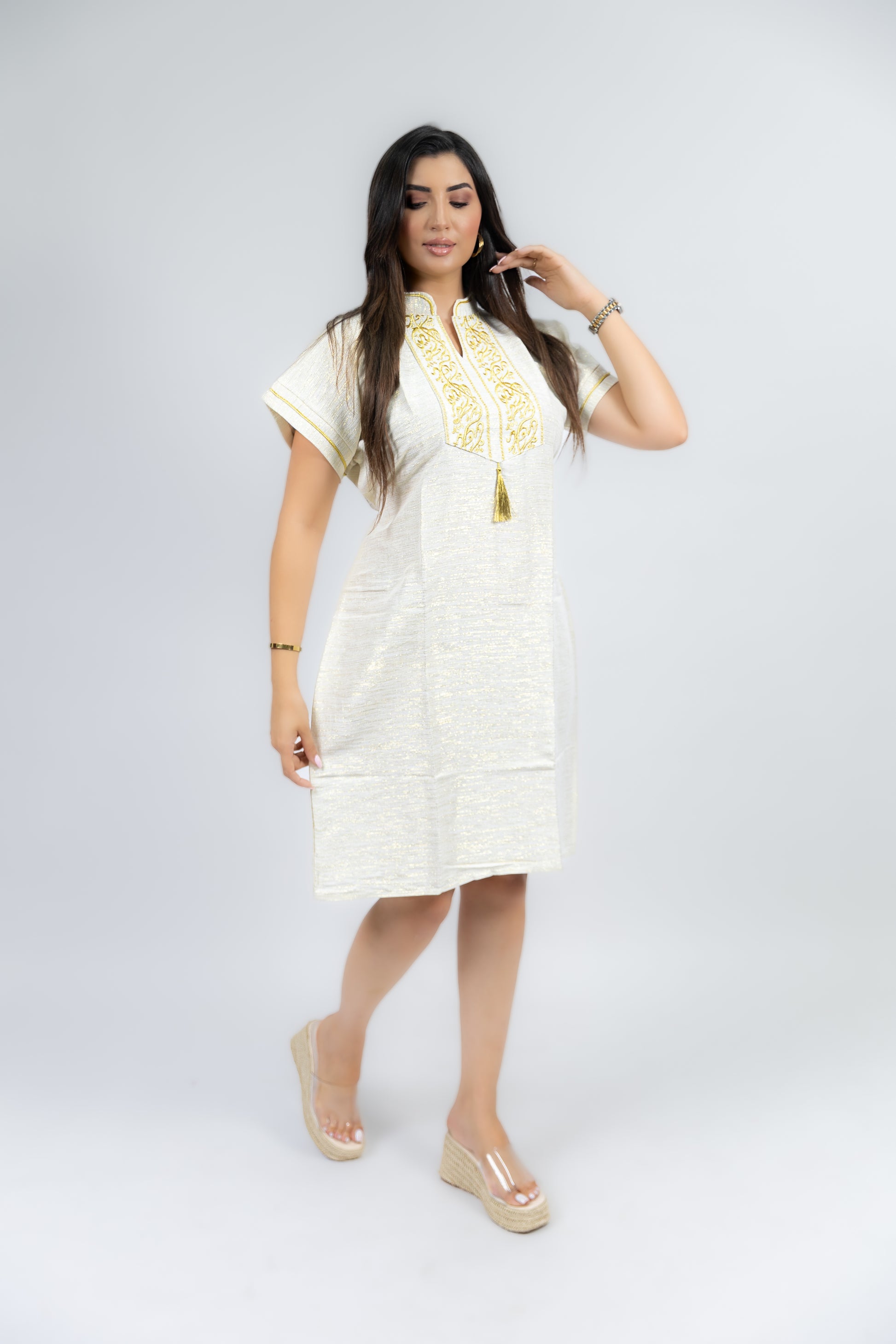جبة أنيقة بخياطة انسيابية وقصّة قصيرة تمنحك راحة وحركة بكل حرية. تتميز بزينة صدر مطرزة بخطوط عربية ذهبية فاخرة، مع ياقة تقليدية باللون الذهبي تضيف لمسة فخامة. التصميم البسيط والمودرن يخليها مناسبة للبس  الراقي أو حتى للمناسبات الخفيفة، أين تلتقي الأصالة بالموضة