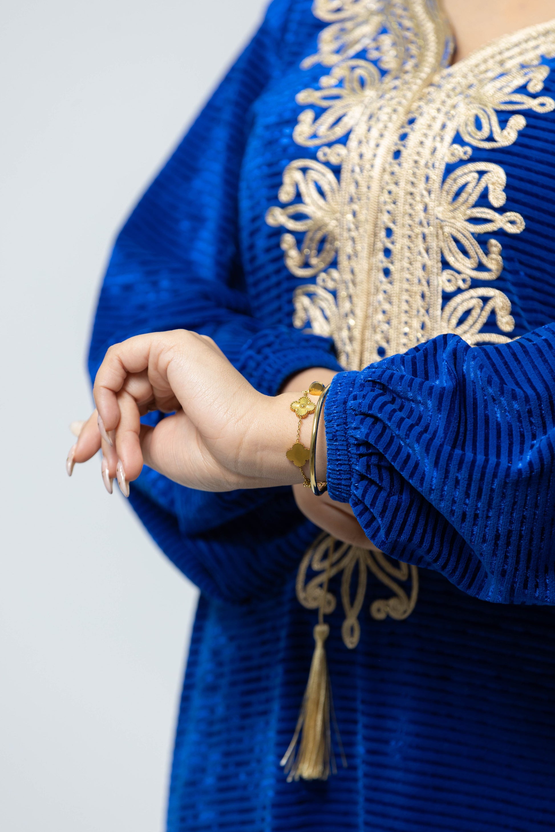 جبّة مخملية بلمعة رايقة تعطي ستيل أنيق ومرتاح. مزينة بتطريز فاخر على الصدر مع شرّابة تزيدها جمال وأصالة. ستيل واسع وخفيف