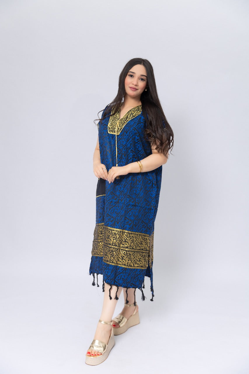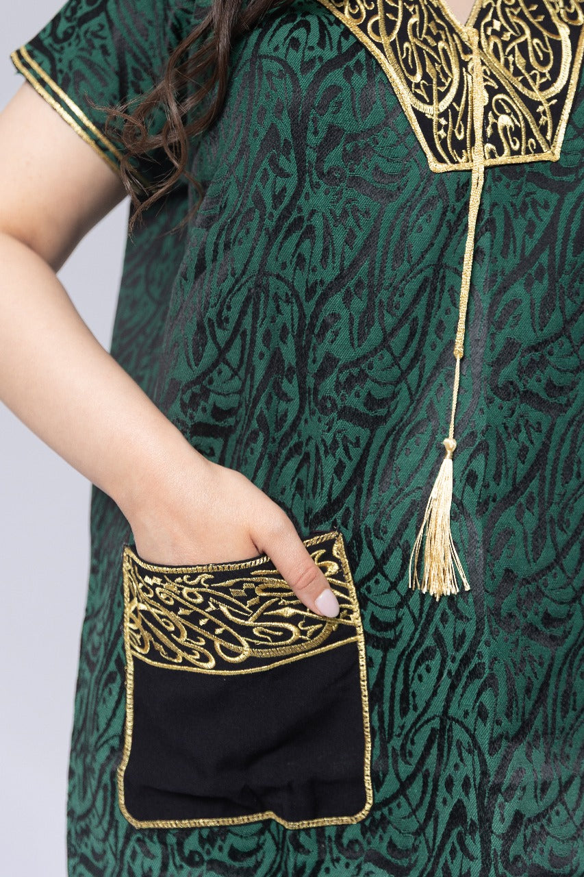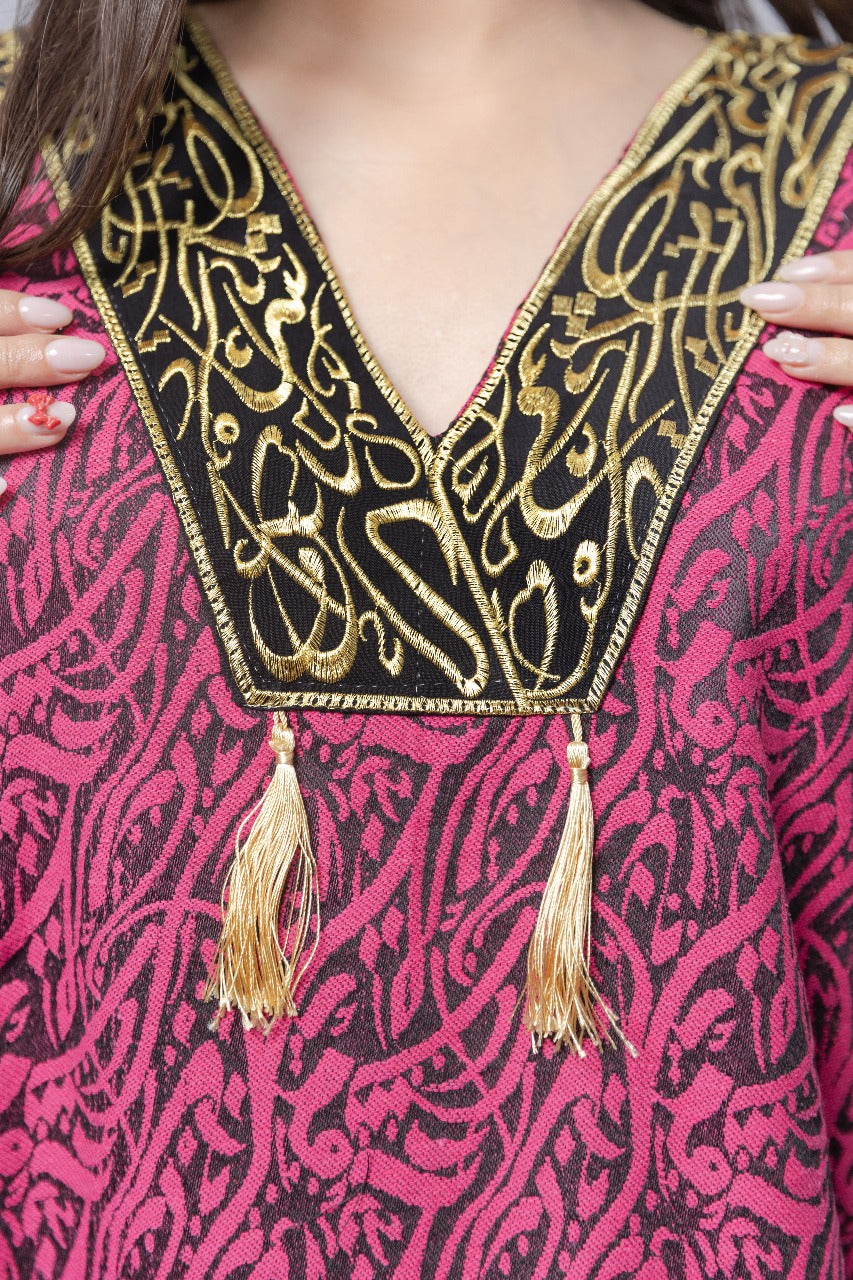 La Jebba Hayek est réalisée en tissu baroque marocain avec une longueur inspirée de la coupe Chanel. Le col, les manches et l’ourlet sont délicatement brodés de calligraphies arabes en fil doré. Idéale pour les soirées du Ramadan, les réunions familiales ainsi que les événements culturels ou spirituels, elle offre un look à la fois élégant et confortable pour un port chez soi.