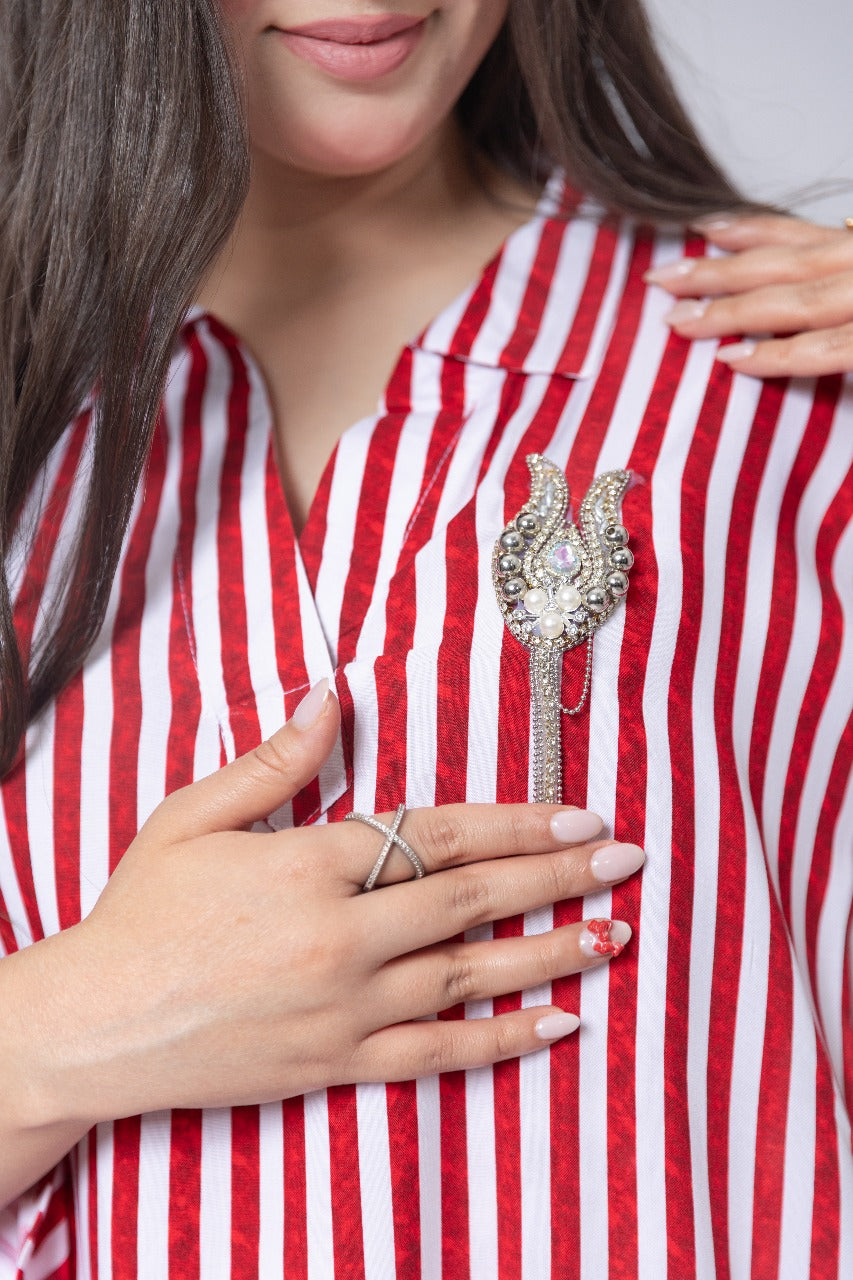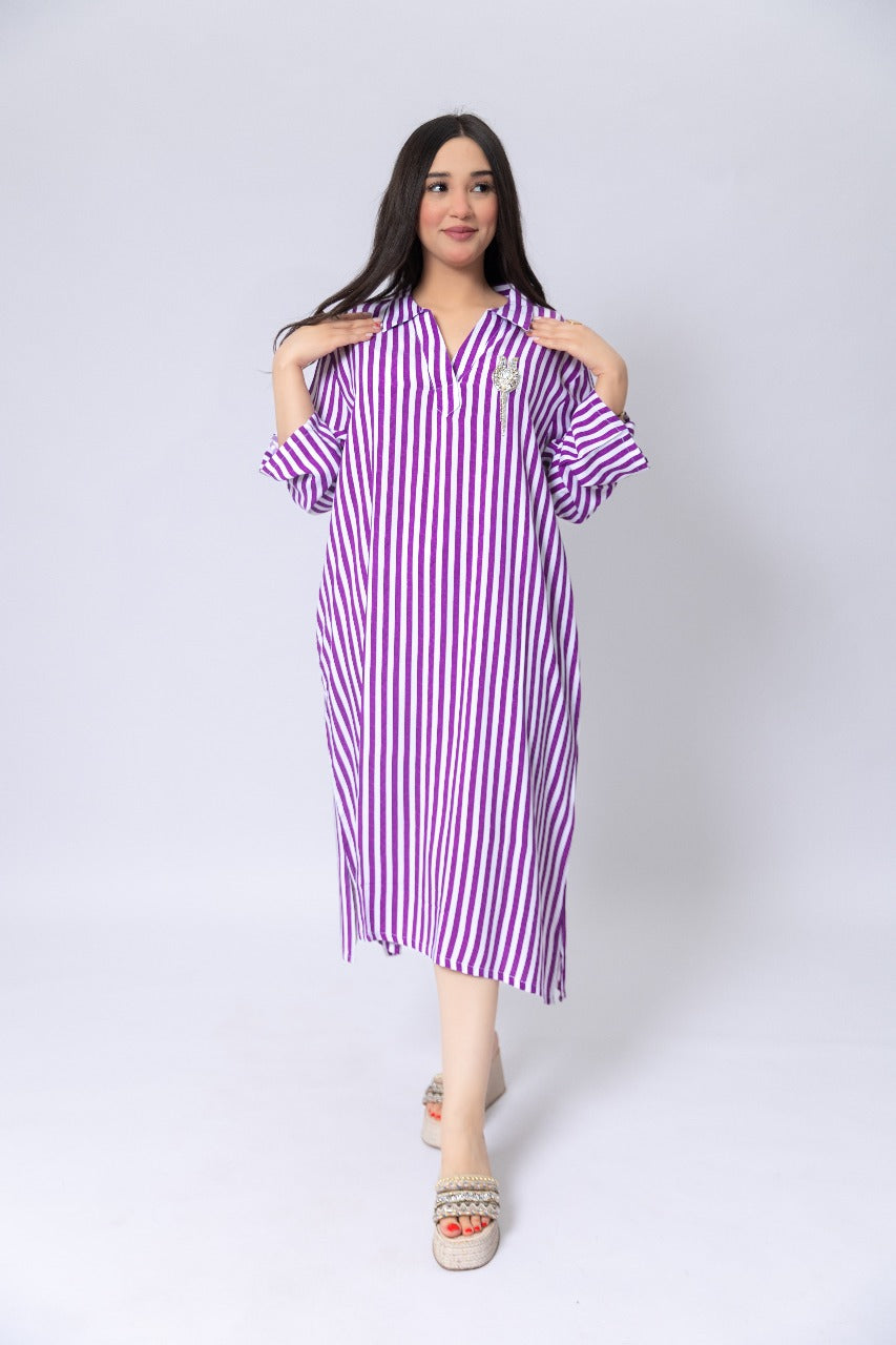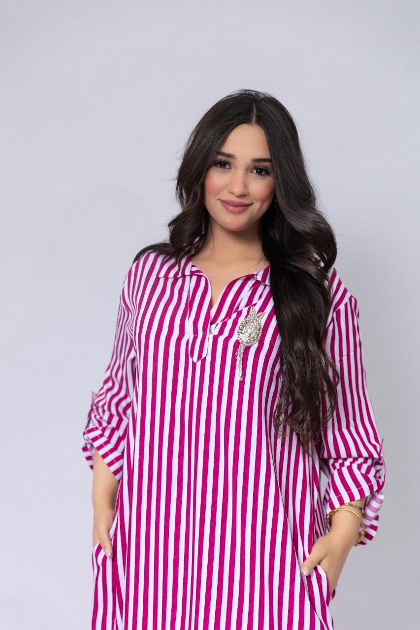 هذا الموديل يتميّز بفستان واسع ومريح بطول متوسط، مصنوع من قماش مخطّط عموديًّا مما يمنح قامة أطول وإطلالة أنيقة. يتميّز بياقة مفتوحة على شكل V مع أكمام طويلة يمكن ثنيها وتثبيتها لإطلالة كاجوال عصرية. التصميم مزوّد بجيوب جانبية عملية، كما أنّه مزيّن ببروش أنيق يضيف لمسة أنثوية راقية.